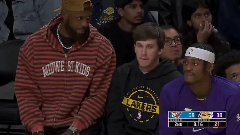 前两天有个美国 医学专家 曝料,里夫斯为了尽快复出,与东契奇一起前往欧洲接受注射治疗,然而昨天湖人的比赛, 转播镜头给到替补席观战的詹姆斯和里夫斯。